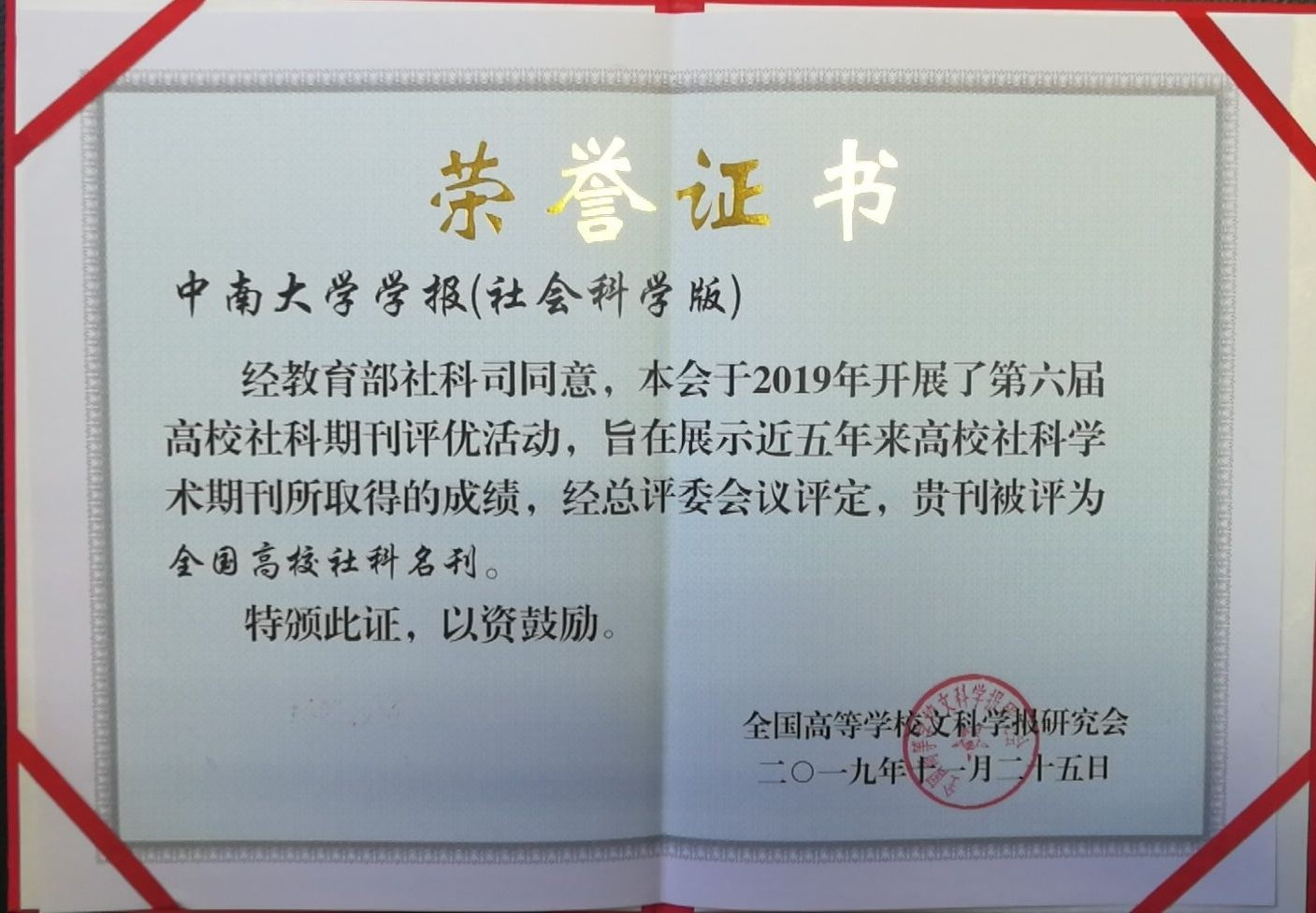 2019年11月26日,“双一流”建设背景下高校学术期刊的责任与使命学术研讨会暨全国高校文科学报研究会第八届理事会第五次会议在广东肇庆召开,会上宣布了全国高校文科学报研究会第六届评优结果,《中南大学学报(社会科学版)》获评最高荣誉“全国高校社科名刊”,同时,胡兴华编辑荣获“全国高校优秀编辑”。