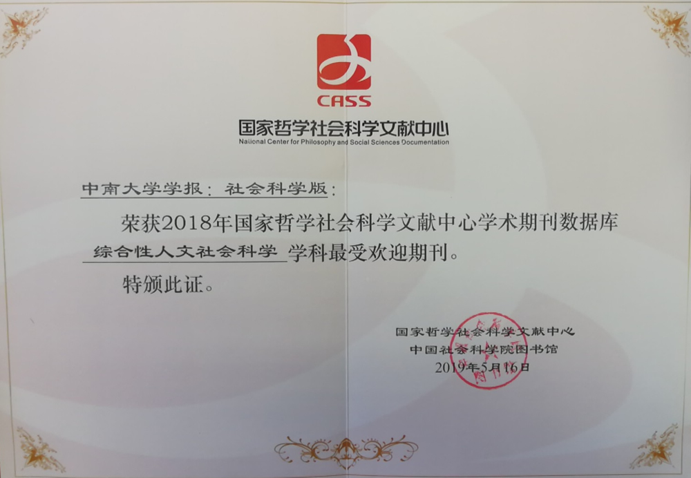 近日,国家哲学社会科学文献中心、中国社会科学院图书馆发布《国家哲学社会科学文献中心学术期刊数据库用户关注度报告(2018年度)》,《中南大学学报(社会科学版)》荣获2018年国家哲学社会科学文献中心学术期刊数据库“综合性人文社会科学学科最受欢迎期刊”称号。